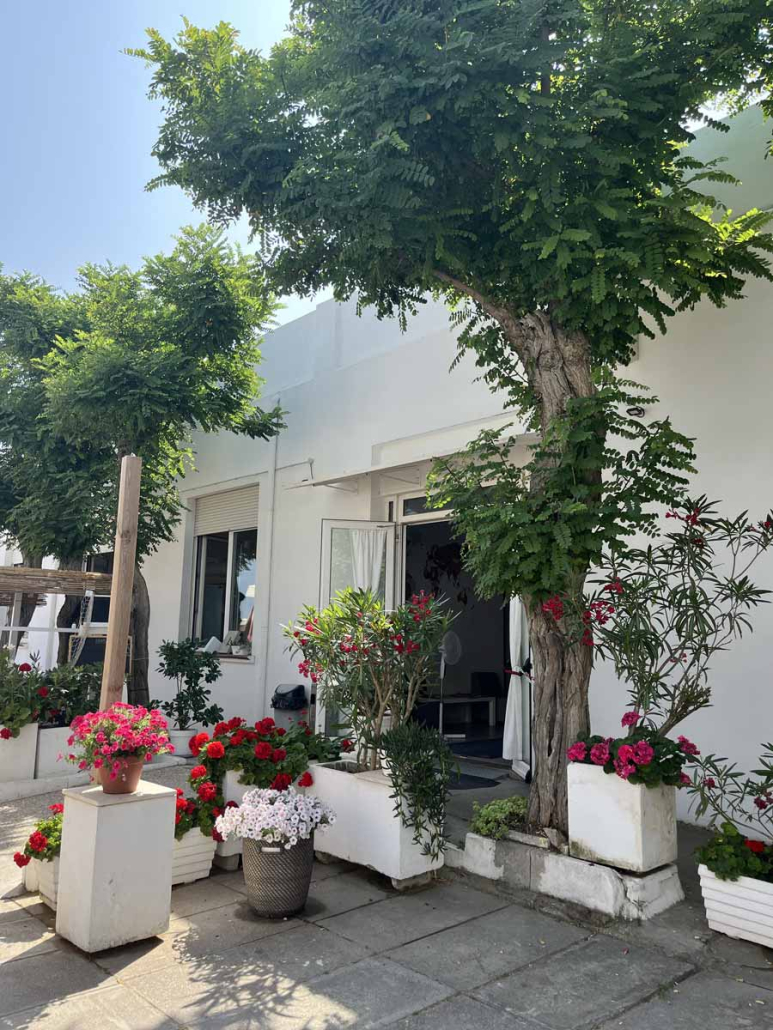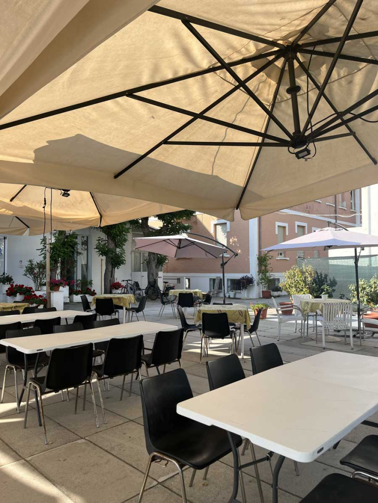 Il grande cortile affacciato sul mare, con docce esterne e un Chiringuito estivo, è perfetto per rilassarsi o godersi un aperitivo.